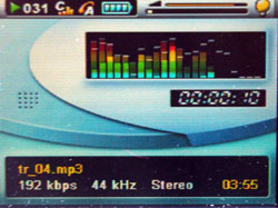 Впрочем, многим пользователям отличные от 44 кГц частоты и не нужны, так что они этого просто не заметят. Но есть к плееру еще одна претензия, а именно — отображение информации о песне. Несмотря на большие (применительно к аудиоплеерам) размеры ЖК-экрана, не отображаются тэги. Никакие! Явный недостаток. В остальном же все неплохо: имя файла, битрейт (в случае VBR так и пишется: "V-Bitrate"), частота дискретизации, режим (стерео или моно), длина файла в минутах и секундах. Чуть выше — нечто типа частотного анализатора и текущая позиция проигрывания.