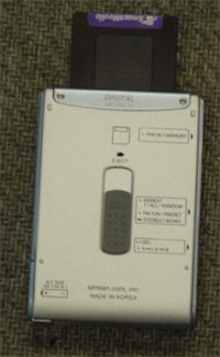Когда встроенных 64 Мбайт перестает хватать, можно расширить объем памяти с помощью SmartMedia карт. Плеер понимает трехвольтовые карточки объемом вплоть до 128 Мбайт, в чем я уже убедился. Карточку можно отформатировать в соответствии со стандартом "для других плееров и цифровых фотоаппаратов", как сказано в инструкции. Видимо, имеется в виду стандарт SSFDC (Solid State Floppy Disk Card). Однако отформатированную таким образом карточку плеер не понимает, хотя ее действительно, можно использовать без переформатирования в цифровом фотоаппарате, в чем я тоже удостоверился на примере камеры Olympus Camedia C-700. Такая возможность плеера и прилагаемого ПО бесценна при использовании SmartMedia-карточек в цифровых камерах, не умеющих осуществлять "низкоуровневый" формат, как уже упомянутый Olympus.
