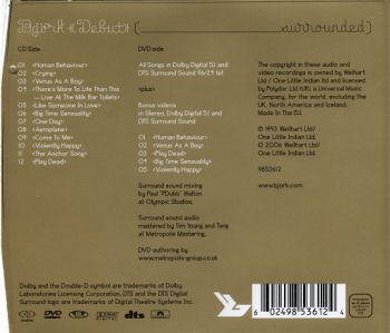 Теперь — о главном. То есть о качестве звука. Именно наличие шестиканального микса является главной приманкой переизданий. Что ж, обновленный Debut действительно звучит неплохо. Объем чувствуется, а пространственные эффекты есть там, где это необходимо. Однако, такого сногсшибательного эффекта, какой производили шестиканальные фонограммы Medulla и Vespertine (оба альбома выходили на DVD-A и SACD), достичь все же не удалось. То ли дело в музыке, не столь богатой на полифонические наслоения, то ли в возрасте записи (13 лет — немалый срок), то ли в излишней осторожности звукорежиссеров, испугавшихся шокировать слушателей неожиданным звучанием давно знакомых песен… Но так или иначе, к образцово-показательным многоканальным миксам аудиодорожки Debut явно не относятся. Если же сравнивать два представленных на диске звуковых формата (DD 5.1 и DTS 96/24), то можно лишний раз убедиться, что, во-первых, DTS 96/24 по-прежнему является лучшим на данный момент форматом звука для DVD, а во-вторых, до уровня Advanced Resolution (DVD-A) и DSD (SACD) не дотягивает даже он. Впрочем, в данном случае выбирать между форматами высокого разрешения не приходится, а единственный доступный выбор (между DD 5.1 и DTS 96/24) совершенно очевиден.