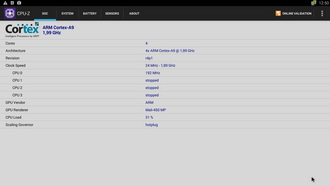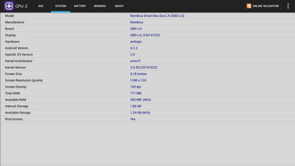Как видим, данные из стандартной оболочки не расходятся с данными, предоставленными лаунчером Rombica. Ну еще бы, это же всего лишь другое графическое представление одной и той же системной информации. Однако более подробные сведения о начинке Android-устройств традиционно дают сторонние приложения, например, CPU-Z. Однако нужно помнить, что некоторые параметры здесь либо отсутствуют (например, сведения о различных датчиках — ведь их попросту нет), либо отображаются неверно. Яркий тому пример — разрешение дисплея и плотность пикселей. Ну откуда тут дисплей? Вместо него — эмулятор, который сообщает сведения, далекие от истины. Например, Rombica Smart Box Duo LX выдает на ТВ честный Full HD-сигнал с частотой 60 Гц, однако в сведениях CPU-Z указывается, что дисплей имеет разрешение 1280×720.