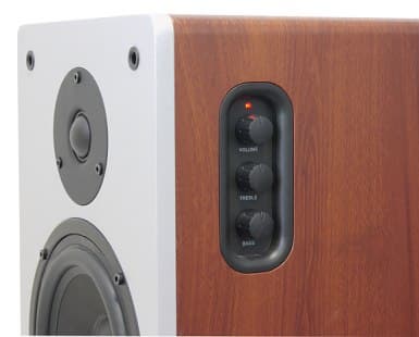 Панель управления расположена на боковой панели активной колонки. Включает в себя регуляторы общей громкости, отдельно низких и высоких частот и индикатор питания.