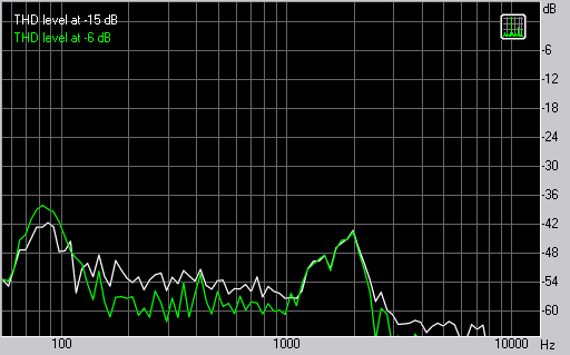 На спектрограммах отдельно 3-й гармоники можно видеть, что уровень искажений на средних и низких частотах практически такой же. И только на высоких частотах от 3 кГц можно наблюдать падение амплитуды до уровня 0,1%. Это свидетельствует о детальном воспроизведении на высоких частотах.