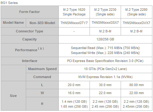 В список накопителей Toshiba BG1 входят интегрированные модели M.2 1620, отличающиеся крайне малыми габаритами 16 х 20 мм и более привычные односторонние SSD M.2 2230. Обмен данными с SoC происходит по интерфейсу PCIe 2.0 х2 (10 гигатранзакций в секунду), скорости потокового чтения и записи достигают 715 и 228 МБ/с соответственно. Объем Toshiba BG1 составляет 128 или 256 ГБ.