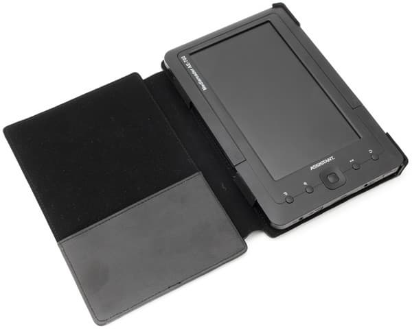Итак, устройство средних размеров — не больше, чем иная электронная книга. Толщина на звание самой маленькой в мире не претендует — 14 мм. Вес составляет 370 граммов — тоже ожидаемо, не много и не мало. В комплекте с книгой поставляется чехол из искусственной (но очень напоминающей настоящую) кожи. Assistant MediaReader AE-702 держится в ней за счет нескольких пластиковых зажимов, и держится довольно крепко. Внутри чехла есть небольшой кармашек. Обложка удобная, менять ее на что-либо другое нет особенного смысла.