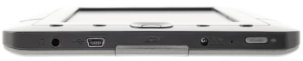 На нижнем торце находятся: отдельные гнезда для шнура mini-USB, для зарядного устройства, для наушников (стандартное 3,5 мм), а также кнопка включения/выключения. При коротком нажатии на эту кнопку устройство отправляется в спящий режим для экономии энергии. Также на нижнем торце имеется заглушка, которую следует подцеплять ногтем — она скрывает гнездо для карты памяти формата SD.