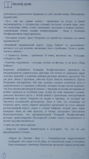 Имеется возможность довольно гибкой настройки яркости экрана, а также цветов шрифта и фона. Например, в темноте можно читать при минимальной яркости с зеленым текстом на черном фоне. Но, к сожалению, нет возможности настроить различные профили — придется каждый раз менять настройки вручную, этот процесс занимает секунд 30. Тем не менее, для каждой книги запоминается свой набор настроек. И второй недочет — текст нельзя развернуть на весь экран, и когда вы смените фон на черный, сверху и снизу останутся белые поля, которые в темноте могут слепить.