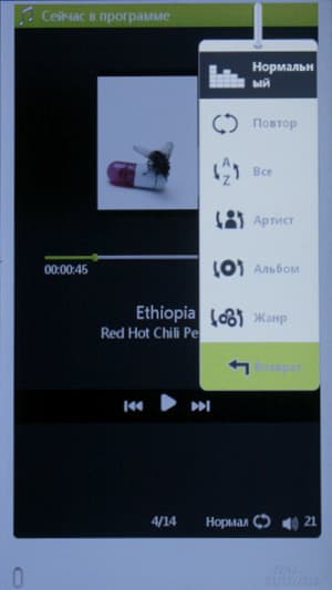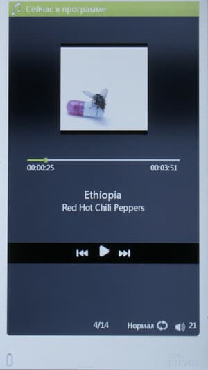 Музыкальный проигрыватель умеет воспроизводить файлы форматов MP3, WMA, AAC, WAV, OGG. Музыка сортируется проигрывателем на основе информации из тегов — по артистам, альбомам, жанрам, также можно вывести список всех найденных в памяти устройства музыкальных композиций. Если же хочется видеть структуру папок и файлов в первозданном виде, можно воспользоваться общим проводником — оттуда можно открывать и книги, и музыку, и видео, и картинки.