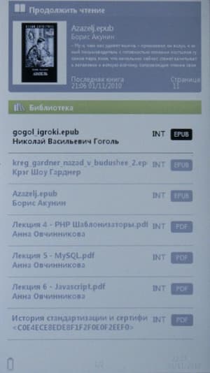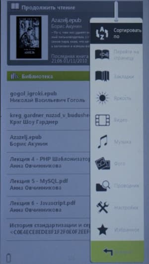 О том, что одно из главных назначений устройства — чтение книг, свидетельствует, помимо названия модели, еще и то, что при включении сразу же открывается список найденных в памяти книг. И уже потом, из контекстного меню, можно переключиться в режим видео- или аудиопроигрывателя.
