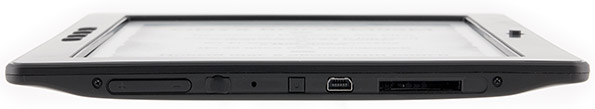 Кнопка перелистывания страниц, размещенная нижнем торце, сразу привлекает внимание своим странным расположением. Действительно: нажимать ее неудобно (особенно, если книга находится в чехле), и на первый взгляд не понятно, что заставило разработчиков поместить ее в такое труднодоступное место. Найти разгадку несложно, если обратить внимание на закрытый заглушкой разъем для наушников и отверстие для микрофона. Дело в том, что все устройства линейки M92M выпускаются в одном и том же корпусе, а на нижнем торце мы можем наблюдать рудименты от аудиосистемы, присутствущей в других моделях серии. Если догадаться, что изначально данная кнопка выполняла функцию регулирования громкости, то все становится на свои места.