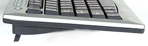 Еще одна особенность клавиатура — это тонкая модель, так что пришлось пойти на уменьшение хода клавиш (3.5 мм). К этому, естественно, нужно привыкнуть, что не всегда будет легко, но вполне реально. Хотя это кому что больше понравится, конечно, но по мне главное, чтоб кнопки имели стандартный, а не уменьшенный размер и более-менее стандартную раскладку. Зато клавиши с уменьшенным ходом производят меньше шума (даже при нормальной «жесткости»), а тонкая нижняя часть позволяет превосходно обойтись без каких-либо подставок. При этом угол наклона достаточно большой, поскольку задняя часть клавиатуры примерно на сантиметр толще. Если кому-нибудь этого мало, то он может воспользоваться парой крепких и надежных ножек, увеличивающих высоту еще примерно на сантиметр.