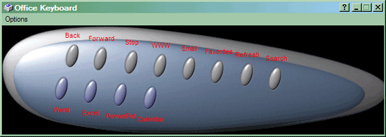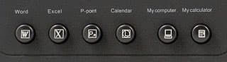 Самое большое же количество дополнительных кнопок, как и следовало, ожидать, разместилось в верхней части клавиатуры — их там аж 25. Но пугаться этого не стоит — к большинству их мы давно привыкли. Первые четыре предназначены для быстрого запуска приложений MS Office (Word, Excel, PowerPoint и Calendar из Outlook), но работают только после установки дополнительных программ. Следующие две такие же по размерам и форме, но чуть отодвинуты от этих (для удобства слепого нахождения) и работают сразу же. Первая открывает «Мой компьютер», вторая запускает стандартный калькулятор.