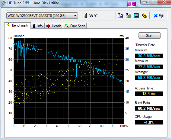 Производительность диска не порадовала, возможно поэтому и скорость загрузки ОС кажется низкой. В ноутбуке HP установлен также диск WD, но более современная модель.
