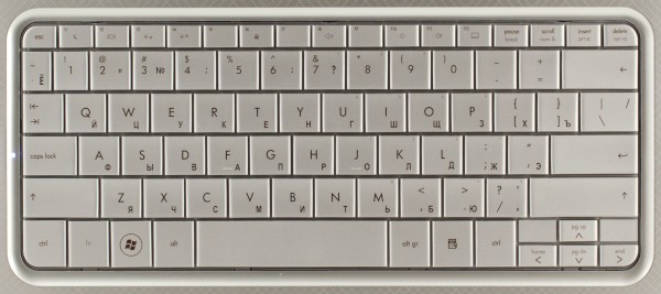 Наиболее оригинальная деталь этого ноутбука — клавиатура, причем обращает на себя внимание не только металлический цвет клавиш. Во-первых, несмотря на габариты, в которые надо было вписать клавиатуру, расстояние между центрами алфавитных клавиш соответствует стандартному для настольной клавиатуры. Во-вторых, клавиши имеют углубления в центре, что уже очень давно не встречается в массовых моделях! Правда, это не совсем классические углубления, выступающими сделаны не боковины клавиши, а ее верх и низ, но при наборе вслепую это уже весьма существенно снижает процент ложных нажатий. Надо также отметить четкие надписи, не в пример упомянутым моделям dm3, где клавиши черные, а символы клавиш, нажимаемых одновременно с Fn, серого цвета, едва различимы еще и из-за маленького размера.