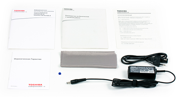 Комплект поставки минимален: кроме самого ноутбука и адаптера питания на 45 Вт (19 В; 2,37 А) в комплект поставки входит лишь краткое руководство пользователя и тряпочка для протирки экрана.