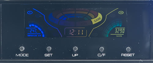 Самый «броский» элемент лицевой панели — ЖК-экран многофункционального модуля. Функция, которая будет полезна любому владельцу корпуса — это часы, которые никак не зависят от материнской платы и т. д., для них предусмотрена собственная батарейка стандартного «компьютерного» типоразмера CR2032. К сожалению, автономность часов не полная: когда компьютер выключен, индикатор вместе с часами просто гаснет.