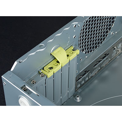 На четыре из семи заглушек для плат расширения установлена пластиковая прижимная рамка. Она легко отщелкивается и фиксируется на место. При весьма неубедительном внешнем виде она оказалась очень эффективной — прижим нашей тестовой видеокарты был крепким, и выпадение из слота карте явно не угрожало. Отметим, что три из четырех слотов под защелкой можно дополнительно зафиксировать винтом под крестовую отвертку. Возможно, в случае применения очень длинной и тяжелой видеокарты, эта мера будет нелишней.