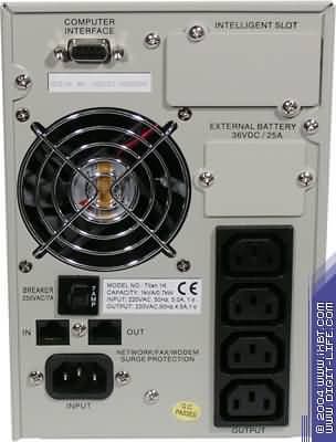 На задней панели — 4 розетки для подключения нагрузки, разъем подключения ИБП к питающей сети, пара разъемов RJ-45 (а не RJ-11, как в первых двух моделях), коммуникационный порт, гнездо для подключения внешнего батарейного блока, прерыватель внутренней цепи ИБП, слот для установки SNMP-адаптера.