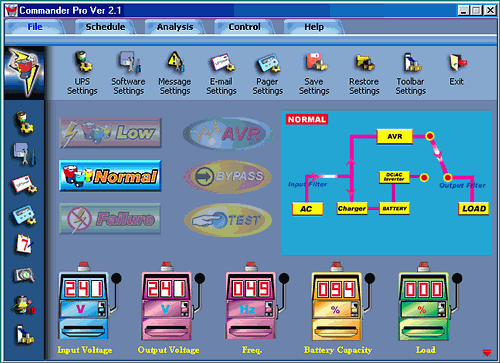 Поставляемое с ИБП ПО — Commander Pro, точно такое же, как у ИБП Ippon Back Power Pro 600, поэтому подробно рассматривать его не будем. Единственное, что хотелось бы отметить: ПО позволило управлять Titan 1K, корректно определив его тип (см. схематическое изображение ИБП), хотя и не смогло определить модель устройства.