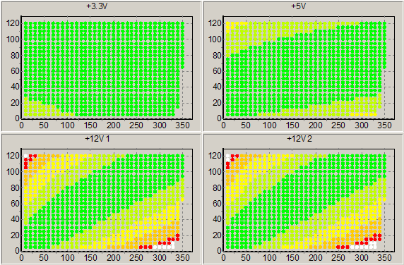 Первым этапом инструментального тестирования является построение кросснагрузочной характеристики (КНХ) и представление ее на полуплоскости, ограниченной максимальной мощностью по шине 3,3&5V, с одной стороны (по оси ординат), и максимальной мощностью по шине 12V с другой стороны — по оси абсцисс. В каждой точке измеренное значение напряжение обозначается цветовым маркером в зависимости от отклонения от номинального значения: