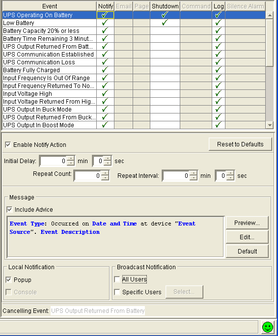 Конфигурирование реакции программы на события сделано очень удобно. В прилагаемой версии можно задать оповещения, выключения и протоколирование событий. После апгрейда лицензии до Advanced Monitoring and System Shutdown, становятся доступны "серые" пункты меню.