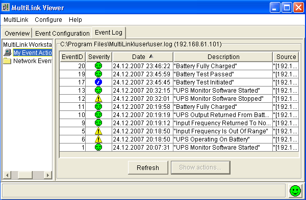 Главное меню программы MultiLink Viewer позволяет сохранить установки конфигурации событий, запустить или остановить сервис связи с ИБП, сконфигурировать основные опции программы. К сожалению, ни выбора языка интерфейса программы, ни справочной системы не предоставляется.