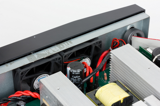 Так как эта модель достаточно мощная и при ее работе электронные компоненты выделяют достаточно большое количества тепла, в ней используется принудительная система вентиляции. За охлаждение отвечают два небольших, но весьма шумных вентилятора DFH7012S (12 В, 0,55 А), которые всегда вращаются с одинаковой скоростью. При этом не важно, подключена ли к ИБП нагрузка, работает ли он батарей или находится в выключенном состоянии — скорость вращения вентиляторов и, соответственно, шум, издаваемый ИБП, всегда одинаковы. Мы измерили шум ИБП в нашей шумоизмерительной комнате, и он составил около 62,2 дБА при измерении сверху в полуметре от источника. Заметим, что в спецификации уровень шума данной модели заявлен как менее 50 дБА.