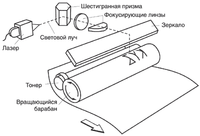 Более правильное название — электрографическая технология. Главная деталь такого принтера — фотобарабан, иногда называемый селеновым. Этот барабан обладает свойством сохранять на своей поверхности электрический заряд, причём дискретно, то есть каждая точка может держать «свой» заряд. Луч лазера, (и вообще свет), попадая на барабан, может «засвечивать» отдельные точки его поверхности, то есть снимать с них электрический заряд. Таким образом, управляя лучом можно «рисовать» на барабане изображение, состоящее из заряженных и незаряженных участков. Далее на барабан просыпается тонер (частицы специального состава), который прилипает к заряженным местам и осыпается с незаряженных. После этого тонер (и изображение соответственно) переносится на бумагу (также предварительно заряженную) и поступает в узел закрепления — «печку», где под воздействием высокой температуры и давления тонер вплавляется в бумагу.