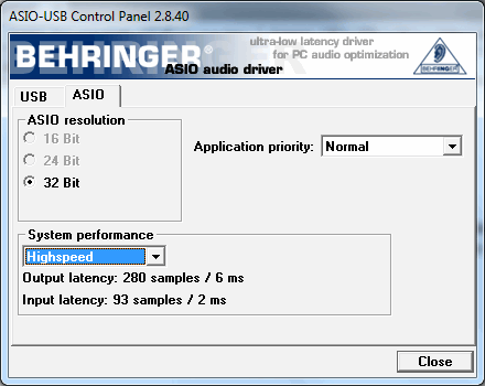 Настройки ASIO расположены на одноименной вкладке. Из имеющихся настроек доступна смена значений Latency и приоритета приложений. В самом быстром режиме Highspeed задержка для выхода и входа составляет 6 и 2 милисекунды соответственно.
