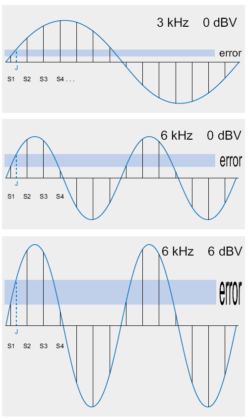 Проиллюстрируем это: предположим, сигнал 1 кГц был оцифрован с 1 нс равномерным по спектру шумоподобным джиттером. По подсчетам, это даст ошибку с уровнем 104 дБ ниже полезного сигнала. Значение этой ошибки останется тем же, вне зависимости от частоты дискретизации конвертора.