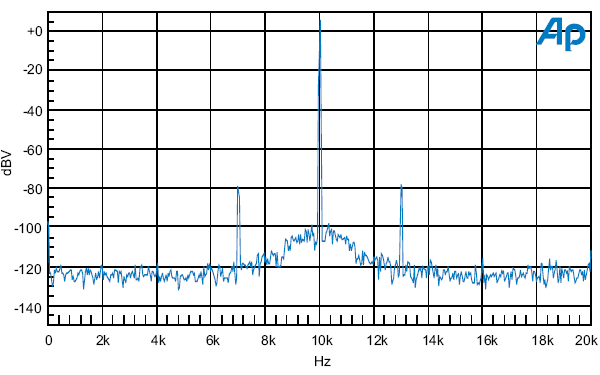Вид каждой боковой полосы соответствует спектру интерфейсного джиттера предыдущей фигуры, так что можно сделать вывод, что нет фильтрации джиттера в этом диапазоне. Боковые полосы 125 Гц каждая примерно на 70 дБ ниже амплитуды основного тона (67 дБ если считать по парам). Это соответствует следующей амплитуде джиттера семплинга для указанной частоты: antilog ((104 - 67) / 20 ) /12 = 6 нс rms.