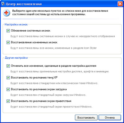 Ну и на всякий случай следует упомянуть об особенностях процесса деинсталляции. Все дело в том, что программа после удаления не может восстановить исходный вид системы, то есть существует два варианта: либо оставляем измененный вид, либо возвращаемся к настройкам Windows по умолчанию.