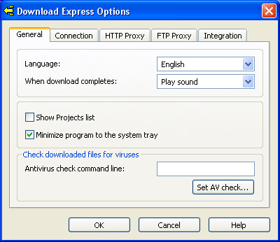 Теперь рассмотрим окно с настройками программы - Options, которое можно вызвать либо из списка проектов (нажав кнопку Options), либо нажав кнопку Advanced в окне загрузки. На вкладке General определяются основные опции программы - язык интерфейса, действия после окончания загрузки (можно поставить сообщение или звуковой сигнал). Если при инсталляции дополнительные возможности не были включены, но в них появилась необходимость - можно нажать кнопку Install ("Инсталлировать") или получить более детальную информацию по данному разделу - кнопка Read more. В нижней секции вкладки General следует указать установленный на вашем компьютере антивирус, который Download Express будет использовать для проверки скачанных файлов, чтобы к вам на компьютер не пробралась какая-нибудь зараза. Проверка будет осуществляться автоматически после завершения процесса загрузки.