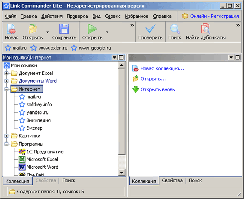 Коллекция представляет собой список ссылок, которые можно группировать по папкам. Она может быть представлена в виде дерева либо списком, отображающим содержимое только текущей папки, подобно тому, как это делают менеджеры файлов (Norton Commander, Total Commander и прочие). Для ссылок, привязанных к файлам, можно задать программу, с помощью которой указанный файл будет открываться.