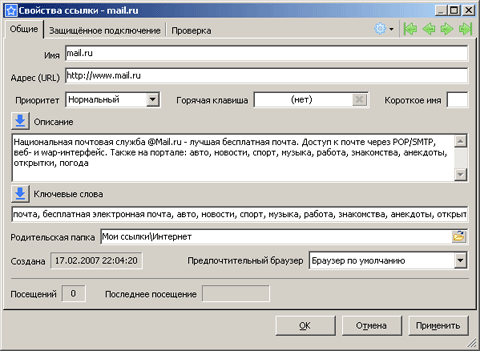В режиме свойств на панели отображаются атрибуты выбранной ссылки или папки. Здесь можно задать имя ссылки, ее адрес, приоритет, "горячую" клавишу для вызова, описание и ключевые слова. Содержание последних двух свойств ссылки, привязанной к странице Интернета, можно загрузить непосредственно с сайта.