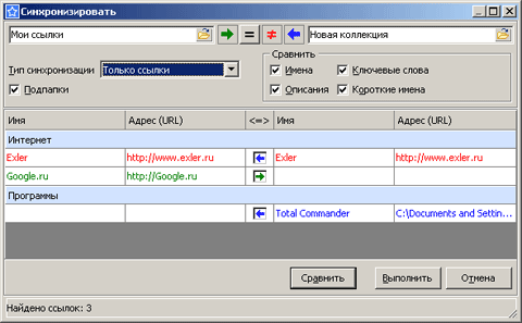 Первая и последняя кнопки с изображением стрелок указывают, что в таблицу синхронизации должны попадать ссылки, присутствующие только в одной из сравниваемых коллекций. Кнопка с изображением знака неравенства добавляет в таблицу синхронизации ссылки с одинаковыми адресами, но разнящиеся в прочих реквизитах. Кнопка с изображением знака равенства показывает в таблице синхронизации идентичные ссылки сравниваемых коллекций. После того как таблица сформирована, в ее центральной колонке можно устанавливать либо снимать маркеры-стрелки, указывающие направление синхронизации (от источника к приемнику).