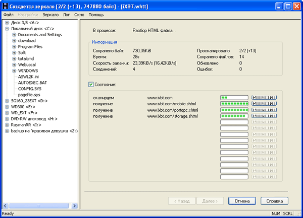 Программа обладает одной важной особенностью, полезной при загрузке больших сайтов. Если внезапно происходит обрыв соединения, то проект не теряется. Вы можете снова подключиться к Сети и продолжить загрузку с прерванного места.