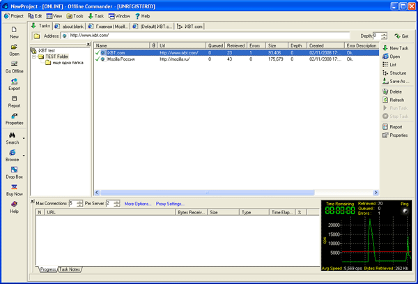 Внутри рабочего окна приложения можно работать только с одним проектом. Он может включать в себя множество сайтов. В отличие от других программ, где адреса представляют собой линейный список, Offline Commander предлагает иерархическую структуру. Вы можете создавать произвольные папки, перемещать между ними сайты простым перетаскиванием мышью.