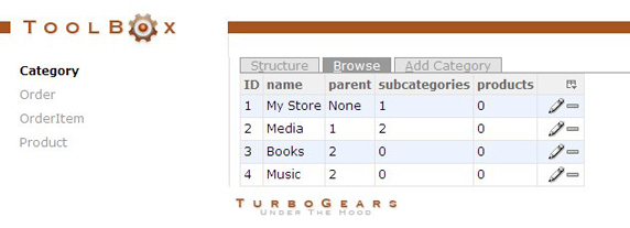 Начиная с версии 0.9, TurboGears стала поставляться с набором инструментариев, называемых Toolbox, которые включают в себя модель браузера (browser), называемого CatWalk. CatWalk спроектирован для разработчиков, которые хотят быстро создавать, обновлять и удалять данные из своих моделей с помощью инструмента GUI.