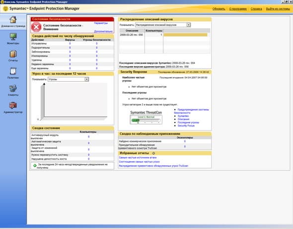 Рисунок 2.4: Endpoint Protection Manager Console – Home Screen – Панель со сводной информацией о состоянии защиты с доступом к основным данным, выбранным отчетам и ресурсам Symantec по безопасности