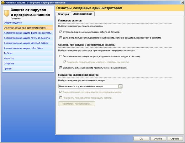Рисунок 2.8a: Endpoint Protection Manager Console – Policies – Antivirus and Antispyware Policy – Настройки политик частично дублируют соответствующие элементы настроек клиентского приложения, на рисунке показаны специфичные настройки, недоступные для клиентов