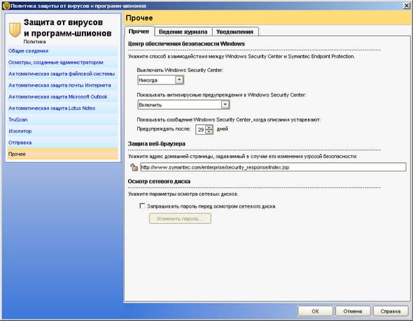 Рисунок 2.8c: Endpoint Protection Manager Console – Policies – Antivirus and Antispyware Policy – На рисунке приведены дополнительные настройки, связанные с взаимодействием со встроенными в Windows средствами безопасности