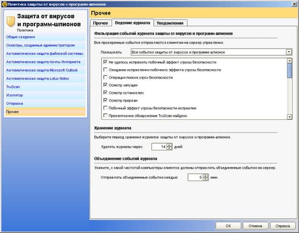 Рисунок 2.21c: Endpoint Protection Manager Console – Clients – Policies – Location-Independent Policies and Settings – Client Log Settings – В данном разделе настроек вы можете задать основные параметры мониторинга на клиентской стороне: какие журналы сколько хранить и как передавать на сервер
