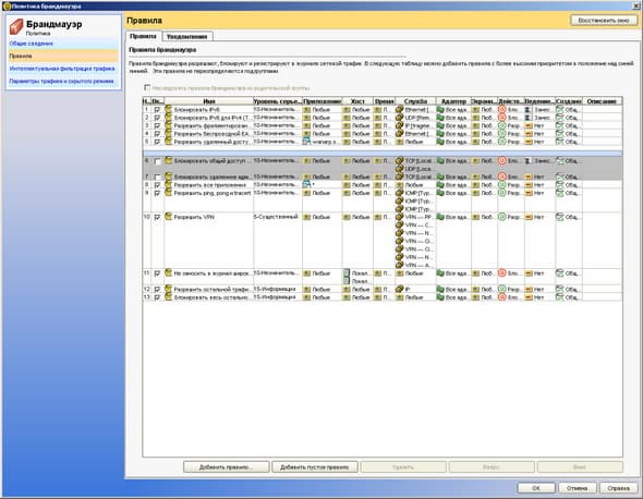 Рисунок 1.13a: Endpoint Protection Client – Network Threat Protection – Configure Firewall Rules – Основная панель настройки правил сетевого доступа для приложений и служб; новая технология, интегрированная в продукт (продублированы на стороне управляющего сервера)
