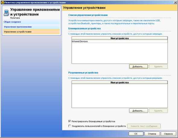 Рисунок 2.13a: Endpoint Protection Manager Console – Policies – Application and Device Control – Device Control – Существуют два варианта блокирования устройств: только определенные, либо все кроме определенных; блокировка возможна при выборе заранее предопределенных классов устройств, которые возможно самостоятельно расширять
