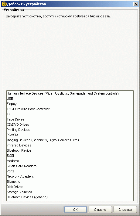 Рисунок 2.13b: Endpoint Protection Manager Console – Policies – Application and Device Control – Device Control – Основной список устройств, который может быть легко расширен