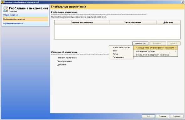 Рисунок 2.15: Endpoint Protection Manager Console – Policies – Centralized Exceptions Policy – Данный элемент настроек групповых политик позволяет создавать общие правила исключений для группы компьютеров: исключения АВ сканирования, проактивной защиты, а также защиты приложений
