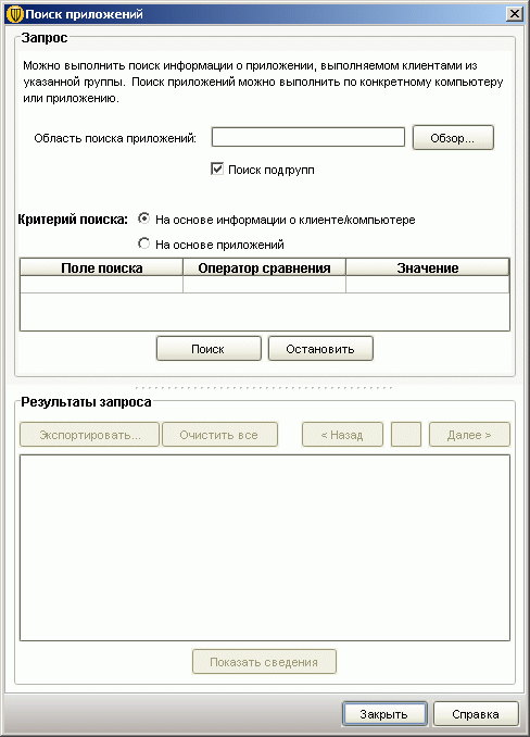Рисунок 2.16: Endpoint Protection Manager Console – Policies – Search for Applications – Данная функция системы позволяет просматривать данные о приложениях, которые запускаются на клиентских станциях, что позволяет их контролировать и при необходимости блокировать, необходима активация функции сбора информации о приложениях (см. Рисунок 2.21d, 2.28b)
