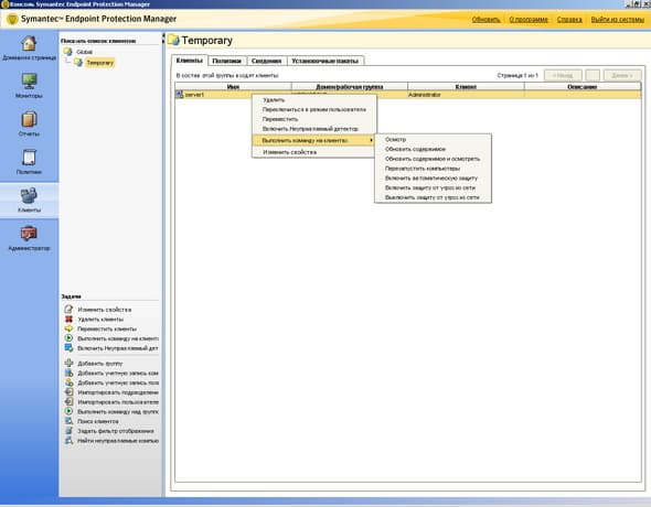 Рисунок 2.17: Endpoint Protection Manager Console – Clients – Clients – Данный раздел консоли управления позволяет производить все операции, связанные с управлением и контролем за клиентскими модулями, включая установку, удаление и настройку
