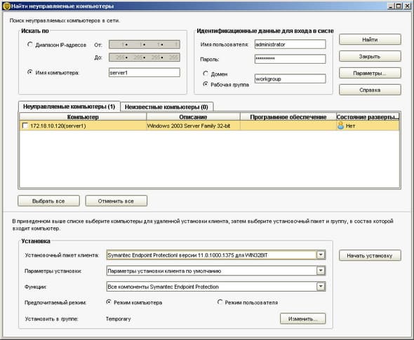 Рисунок 2.18: Endpoint Protection Manager Console – Clients – Clients – Find Unmanaged Computers – Представленное диалоговое окно позволяет производить поиск клиентских компьютеров с отсутствующей защитой или с не подключенной к серверу, с возможностью автоматической установки любого из имеющихся пакетов, поиск может производиться как по диапазону IP-адресов, так и по именам хостов
