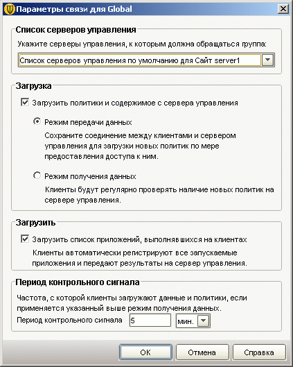 Рисунок 2.21d: Endpoint Protection Manager Console – Clients – Policies – Location-Independent Policies and Settings – Communication Settings – Основные настройки, позволяющие устанавливать тип коммуникаций между управляющим серверов и клиентами: поддерживаются режимы Push (постоянное соединение) и Pull (регулярное соединение через заданные интервалы времени), также здесь активируется возможность сбора клиентами информации о запускаемых приложениях. Также данные настройки могут автоматически меняться в зависимости от места нахождения клиентского хоста